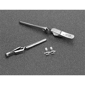 又稱(chēng)顯微血管夾,或者小動(dòng)物血管夾,特殊不銹鋼材質(zhì)。當小鼠等小動(dòng)物做血管(或者尿管)方面的實(shí)驗時(shí),該血管夾提供了一個(gè)簡(jiǎn)單和安全的辦法來(lái)制止血液的流動(dòng)。千萬(wàn)不要用手指來(lái)操作微型血管夾,那樣會(huì )非常困難并且有可能破壞血管夾。這里需要一把與微型血管夾配套使用的長(cháng)直型鑷子,該鑷子端部有齒且粗壯有力,便于夾持。