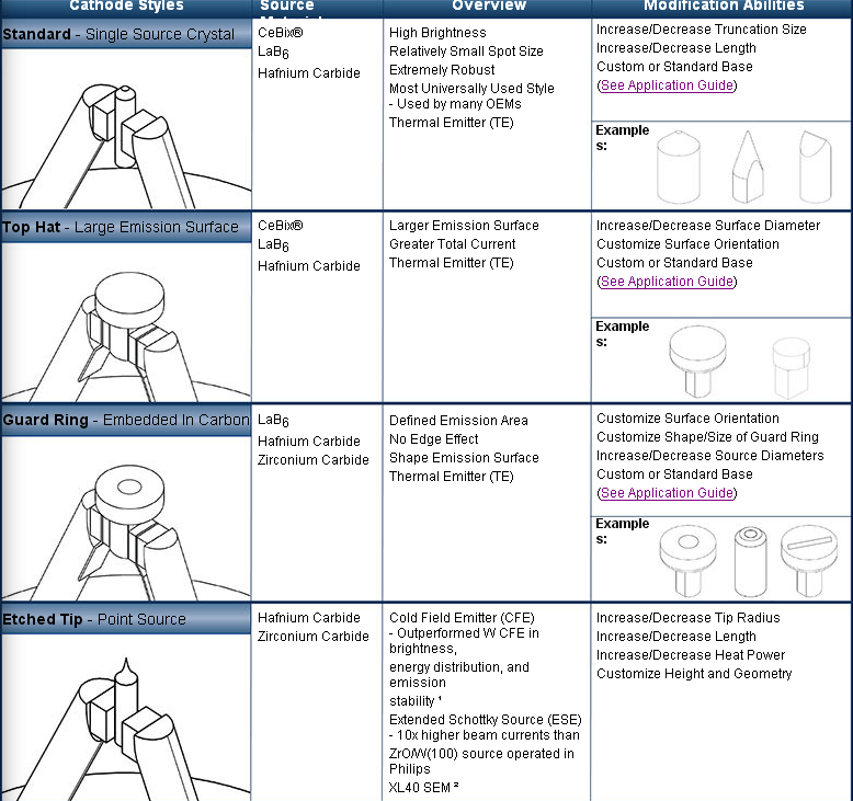 APTECH公司帶給大家四種常見(jiàn)材料的的電子發(fā)射源。熱游離發(fā)射thermal emission (TE)源有六硼化鑭(LaB6)和六硼化鈰(CeBix®)燈絲兩種;場(chǎng)發(fā)射電子槍有兩種:冷場(chǎng)發(fā)射式(cold field emission , FE),熱場(chǎng)發(fā)射式(thermal field emission ,TF),過(guò)渡金屬元素常作為場(chǎng)發(fā)射材料,而難熔金屬往往作為冷場(chǎng)發(fā)射源。