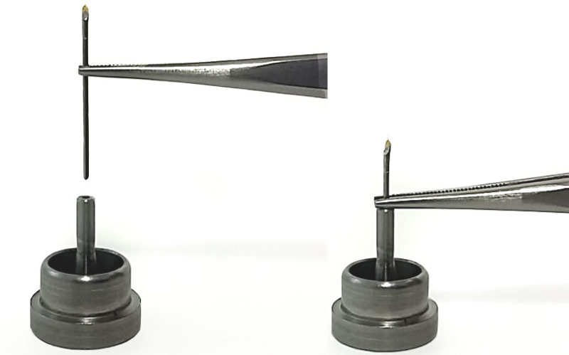 MicroMounts™裝配在一個(gè)無(wú)磁不銹鋼柱形針上,不銹鋼柱形針的直徑大約0.64mm。鋼柱長(cháng)度18mm/SPINE,其它規格11mm,19mm,25mm也提供(購買(mǎi)時(shí)需指出)。因為鋼柱的直徑0.64,我們也可以用0.7mm的自動(dòng)鉛筆來(lái)作為拿取桿子,夾取MicroMounts™需要一把尖部帶齒的鑷子。
