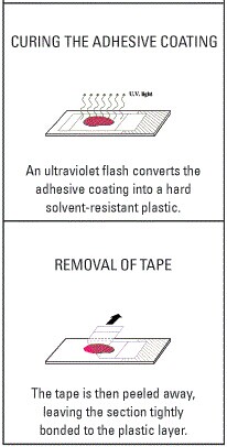 Glass slide with adhesive coating, when polymerized, bonds the still-frozen section from the tape to the slide. Avoid thawing the section. ½ x coating slides for mild to normal tissues. |