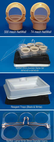 為確保實(shí)驗的快速和高效,我們?yōu)楹Y籃配套了提手及籃架(carrier kit)和試劑盤(pán)(reagent tray)。篩籃可以直接放進(jìn)籃架,提到試劑盤(pán)進(jìn)行固定或者染色實(shí)驗。試劑盤(pán)兩種顏色可供選擇:白色和黑色,白色試劑盤(pán)便于觀(guān)察顏色變化。黑色試劑盤(pán)便于清楚觀(guān)察切片位置。方便大家使用,我們提供以下套裝,套裝包含6個(gè)直徑24mm的netwell(或者12個(gè)直徑15mm的netwell);兩個(gè)試劑盤(pán)(一黑一白);提籃一套(carrier plate 和handle)。