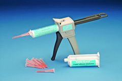 Sylgard 184硅橡膠(Kwik-Gard™Start Up kit)特別適合科學(xué)研究應用??梢允∪セ旌蟽煞N膠帶來(lái)的麻煩和時(shí)間的浪費。當推進(jìn)注射器時(shí)自動(dòng)在尖部混合,無(wú)任何氣泡,直接用于位點(diǎn)。更換尖端就可以重復使用,有效避免了浪費。每針筒含有37ml的硅膠樹(shù)脂和固化劑,針筒頭(tip)的體積0.75ml。針筒內的硅橡膠是Sylgard 184,液體組分組成的雙組分產(chǎn)品,包括硅膠組分與固化劑。硅膠組分與固化劑按10:1重量比完全混合,形成中等粘度混合液,混合液將固化成為具有韌性的透明彈性體,硅橡膠在25℃的溫度固化需要24h,無(wú)放熱現象,無(wú)需二次固化。