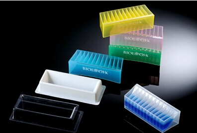 12道彩色試劑槽,每道的容積為5ml,并且每道都有印刷的數字標識,試劑槽反面同樣可以使用,可以容納50ml液體,材料為醫療級聚丙烯,不消毒,5種混合色:紅,藍,綠,黃和透明色,100個(gè)/箱。