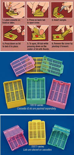 由乙?;酆衔镏谱鞫?,這種特殊的高密度聚合物,能使樣本安全的浸沒(méi)在溶液中。包埋盒對大多數組織溶劑有抗性,盒表面柵格能為液體交換提供最大流量、最適排水。蓋子或者附著(zhù)在包埋盒上,或者獨立包裝。根據使用需求蓋子能夠隨時(shí)開(kāi)、合,隨時(shí)安全鎖定,不會(huì )損傷樣本。包埋盒三面均有較大的空白標記區域,方便使用。