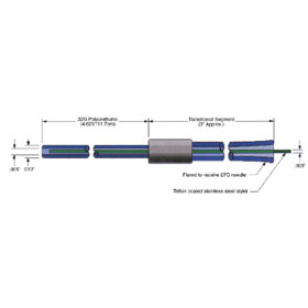 該導管系統提供最小直徑導管 /管芯產(chǎn)品,適用于小鼠和其它小型研究動(dòng)物的心血管、顱內實(shí)驗應用。32G小鼠顱內導管構造圖見(jiàn)下,前端也是主要部分長(cháng)11.7cm,尺寸32G 的聚氨酯導管(0.010英寸O.D./ 0.005英寸 I.D.);緊接著(zhù)后段是過(guò)渡連接區域長(cháng)大約7.6cm,其末端膨大為喇叭形連接口(可配套27 G 針);整個(gè)導管內有一條直徑 0.003英寸 的特氟龍材料包被的不銹鋼針(鈍頭針)。該導管系統獨立包裝。