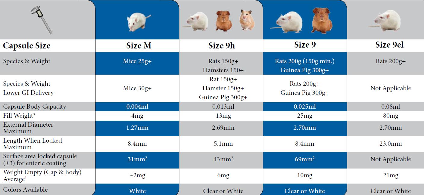 小動(dòng)物專(zhuān)用膠囊根據使用對象的個(gè)體大小分為四個(gè)級別:9el號、9號、9H和M號。9號適用于大鼠(體重150g以上)和豚鼠;M號適用于體重大于30g的小鼠。另外,9號還適用于大鼠(200g-250g)的肛腸給藥(是不是也要考慮包衣問(wèn)題?)??紤]到9el號膠囊太大,不適合腸溶,就不給出包衣的指導面積了。
