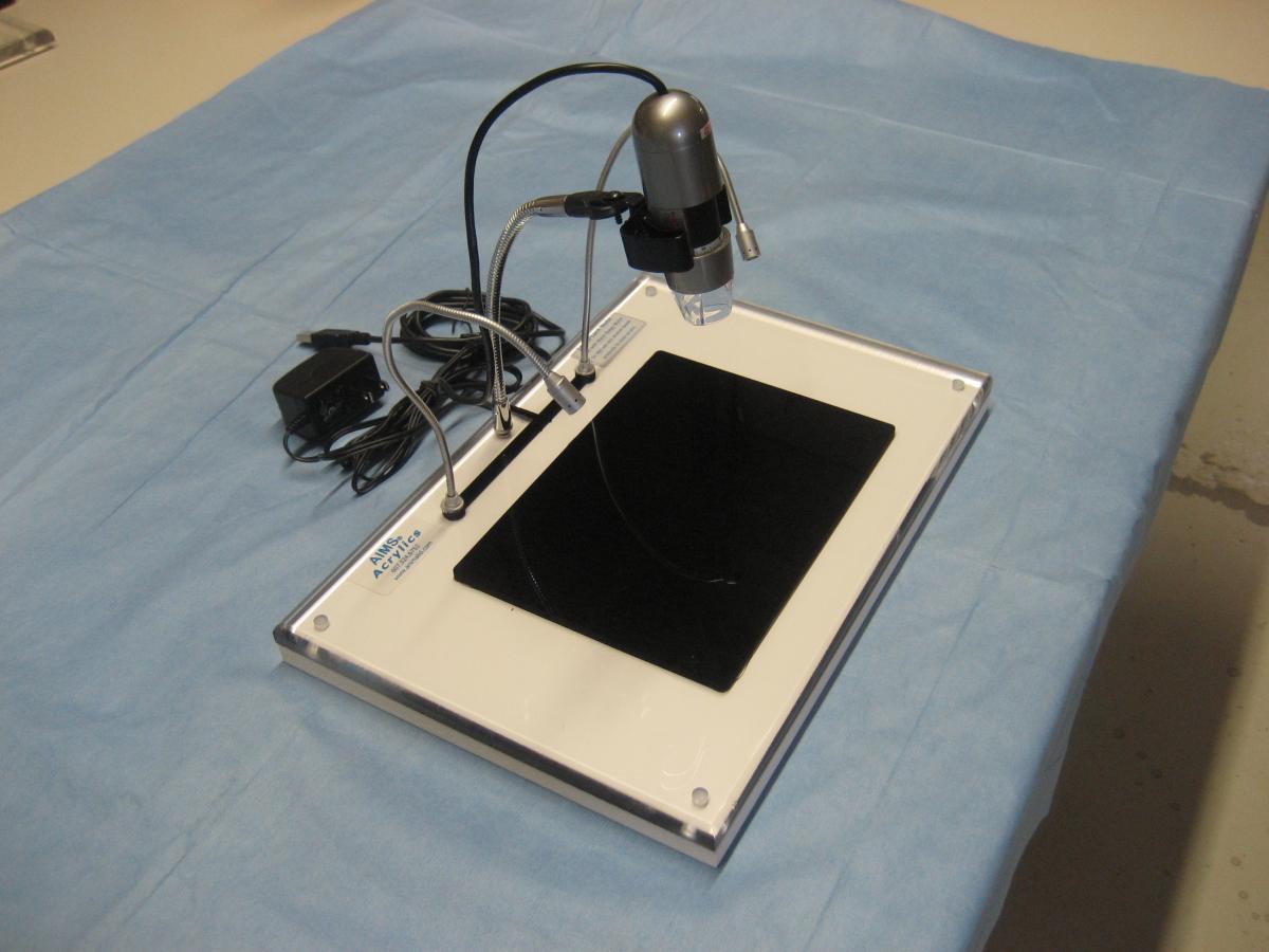 手術(shù)臺上同時(shí)配套的其他設備:兩個(gè)LED燈,提供無(wú)影照明。放大鏡(主鏡頭2.3x,內嵌鏡頭4.0x)輔助視野。