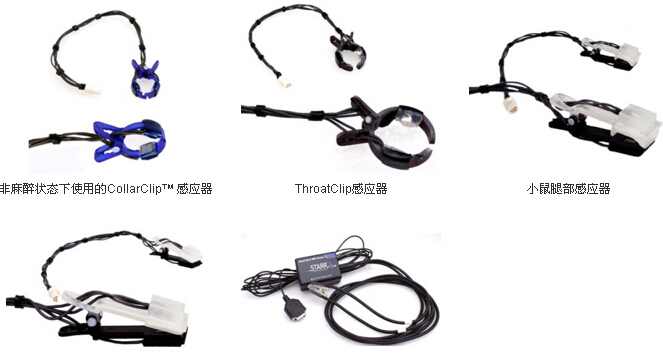 MouseOx Plus也即設備盒子,單獨這個(gè)設備并不能順利開(kāi)展工作,除去必備的電腦之外,傳感器(sensor clip)是必須選擇的配件。傳感器一般通過(guò)通用纜線(xiàn)(Universal Cable)與設備盒子連接??筛鶕?shí)驗對象來(lái)選擇夾持在動(dòng)物的不同體位的傳感器。