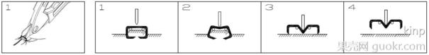 2、合攏拆釘鉗,使鍘刀下壓縫合釘并使之變形(如圖1,2,3,4),縫合釘就很輕松脫離皮膚。