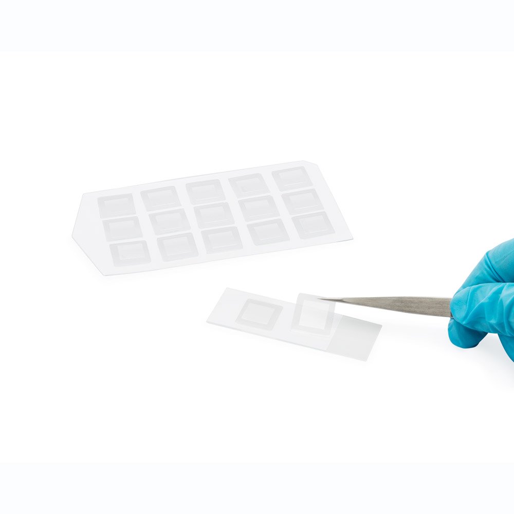 產(chǎn)品由上下兩部分構成:上層是No.1.5厚度的玻璃蓋玻片,下層是0.5mm厚度的透明硅膠片,無(wú)菌直接使用。設計上硅膠片較玻璃片略大,比如蓋玻片12*12mm大小,下方的硅膠片17*17mm大小,產(chǎn)品大小特別適于培養皿和培養板使用。包裝時(shí),背襯底板是透明大塑料板,一板15個(gè),一包有5板(共計75個(gè))。