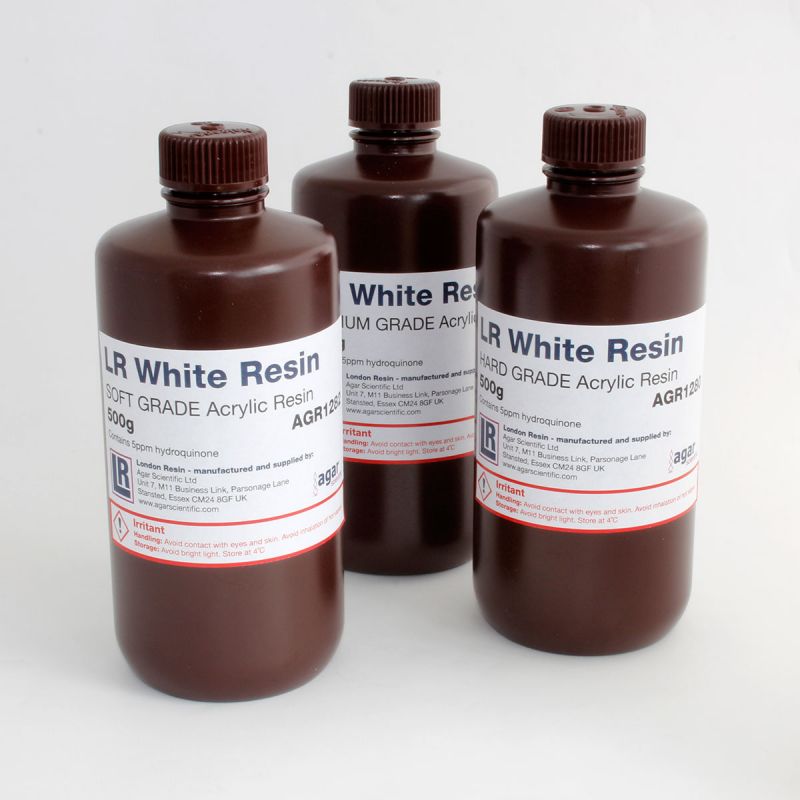 LR White樹(shù)脂包埋劑是多羥基丙烯酸樹(shù)脂,具有很高的親水性,以往僅用于電鏡免疫組化,現在光學(xué)顯微鏡方面也在應用。因為聚合后的樹(shù)脂是親水的,所以免疫組化實(shí)驗中該樹(shù)脂很容易滲透進(jìn)切片,切片不必進(jìn)行冰凍蝕刻(蝕刻往往會(huì )影響組織抗原)處理。在實(shí)踐中發(fā)現LR White具有較好的穩定性,脫水要求不高,聚合時(shí)間短,容易切片,染色時(shí)間短等特點(diǎn)。